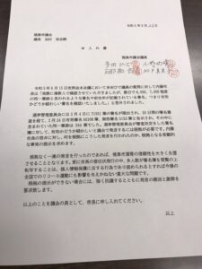これに対し、後日とリコールの会の推薦議員で「その根拠を示してほしい。」と議長宛に提出しました。