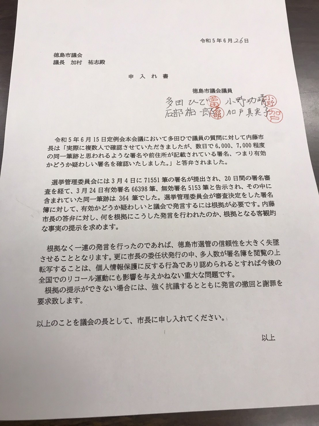 「選挙管理委員会が無効と判断した以外にも、まだ6000~7000筆の同一筆跡を確認した。」