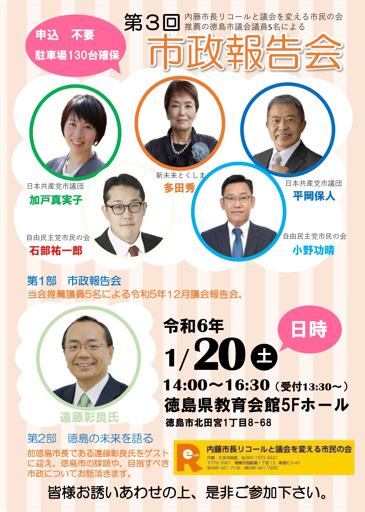 第3回市政報告会 / 未分類 / By 多田ひでを見守る会 令和6年1月20日(土)14:00より徳島県教育会館5Fホールに於いて、 「内藤市長リコールと議会を変える市民の会推薦徳島市議会議員」5名による 第3回市政報告会を行います。 また次期徳島市長選挙立候補予定者の遠藤彰良氏をゲストにお迎えし、 徳島市の課題や目指すべき市政についてお話いただきます。 皆様お誘いあわせの上、ぜひご来場ください。