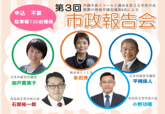 令和6年1月20日(土)14:00より徳島県教育会館5Fホールに於いて、 「内藤市長リコールと議会を変える市民の会推薦徳島市議会議員」5名による 第3回市政報告会を行います。 また次期徳島市長選挙立候補予定者の遠藤彰良氏